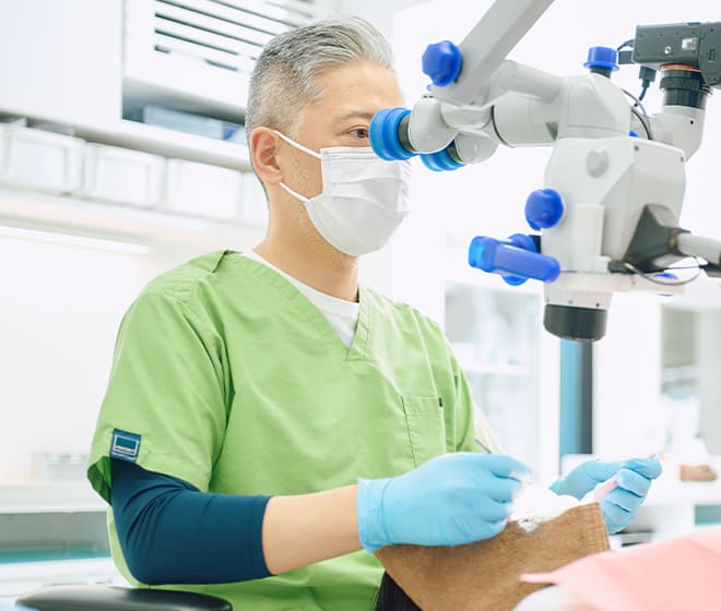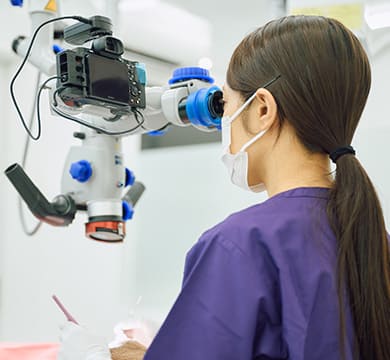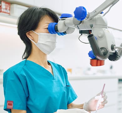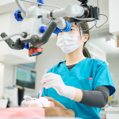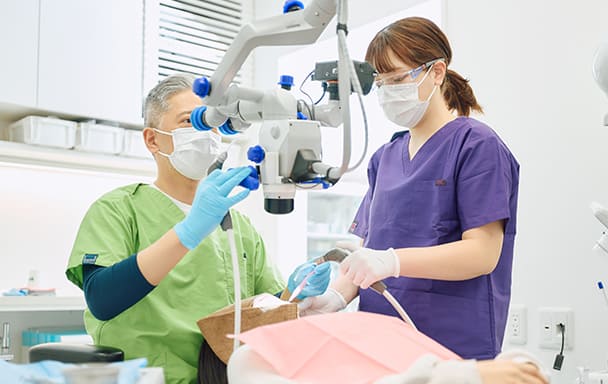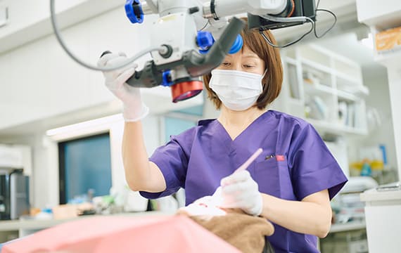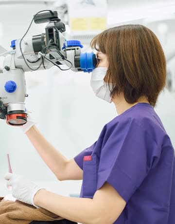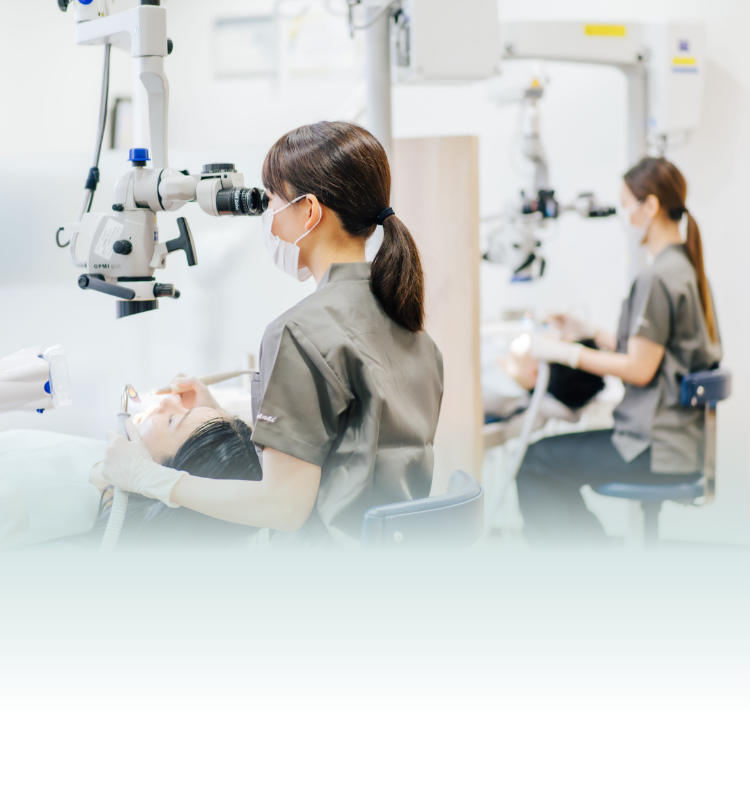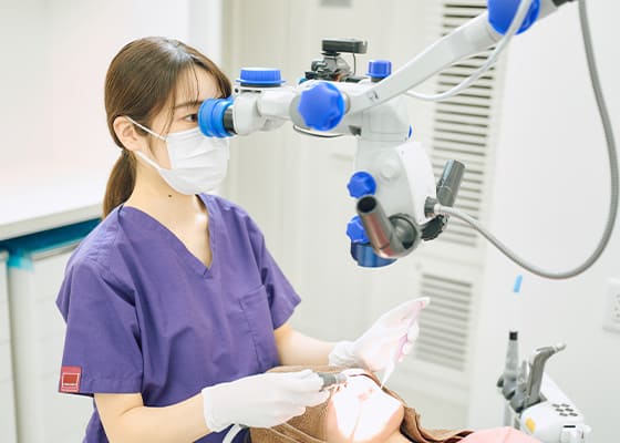 歯科衛生士の予防・メインテナンス、また歯周病治療の際にもマイクロスコープを使用します。保険診療であってもマイクロスコープを活用し、トラブルの原因をきちんと取り除き、歯を健康へと導く精密な診療につなげています。また、スタッフ全員がマイクロスコープを正しく使えるように、日々の研鑽を欠かしません。