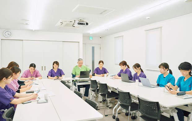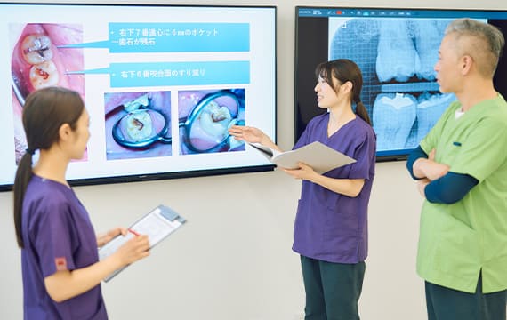 当院では、診療の繰り返しを防ぐ精密な治療のため、歯科医師・歯科衛生士・アシスタントがそれぞれの専門性を活かしつつ、密に連携しています。より良い診療をご提供するために、毎週情報を持ち寄ってディスカッションしたり、勉強会を開催することを欠かしません。院内にはセミナールームも完備。情報共有しやすい環境を整えています。