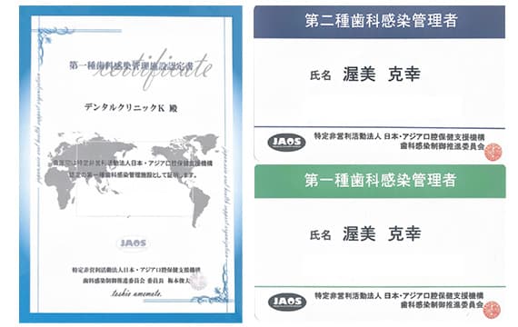 歯科に特化した感染制御知識を持つ「第二種歯科感染管理者」が7名在籍しています。院長は、さらに上位資格である「第一種歯科感染管理者」の資格を取得しています。患者さんが安心・安全に診療を受けられるよう、当院では、在籍期間が3年以上のスタッフ全員に「第二種歯科感染管理者」の資格取得を義務付けています。