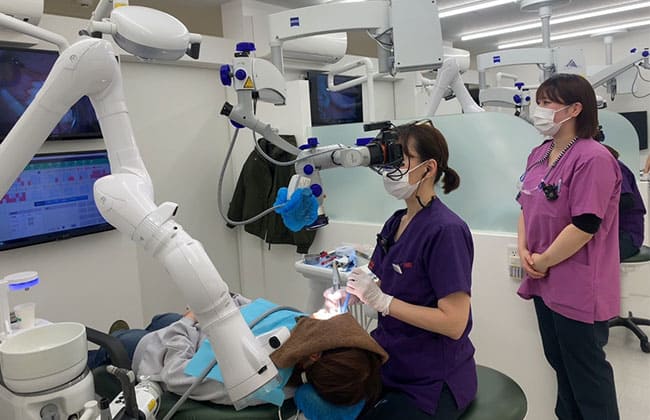 先輩歯科衛生士の側で、マイクロスコープを使い細かな手技を確認しながら学べます。